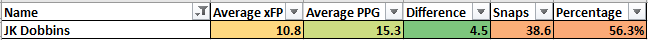 Ekeler’s snap share and snap percentage look very similar to Alvin Kamara’s. Neither are elite in that department, but they both have solid overall opportunity numbers thanks to their heavy involvement in the passing game.