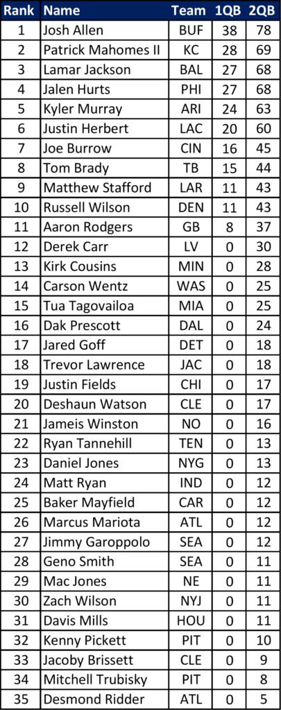 At the beginning of the season, I can calculate trade values via the same method I used to determine auction prices. The values in the chart don’t perfectly correlate to auction prices. I have made slight changes based on the FantasyPros ECR, results from Weeks 1 and 2, The Wolf’s Rest of Season Rankings, and my expected fantasy points analysis (available every Wednesday). But for the most part, the below values should closely reflect consensus projections.