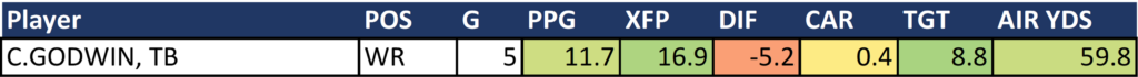 Godwin hasn’t scored a touchdown this year, which makes his raw fantasy point totals look pedestrian compared to other top options. He will almost certainly score at least a few touchdowns on the season even if the offense doesn’t improve. However, with his target volume and talent, he still has access to an elite ceiling if the offense starts clicking.