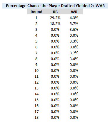 Taking a running back with my first two picks worked well for me in this mock. I would recommend drafting Ekeler or CMC at 1.05 if possible. I am also comfortable drafting any of the top-9 RBs at the 2.08. Having the position locked down early allowed me to take value at WR later, which the data supports as a solid approach.