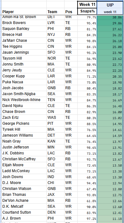 UIP — (USG/INVL)*PPR. Similarly, UIP is just a player’s snap percentage multiplied by their PPR score over the week(s), and to me “UIP” is easier to think of than any abbreviation that would come from “snap percentage times PPR”