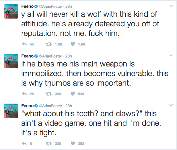 Right off the bat, it sounds a little crazy. Maybe just fire off that one tweet, reply to a doubter or two, and leave it at that. Realistically any human is probably getting mauled by a wolf, and 99.9% of people are ok with accepting that. But not old Arian Foster, no sir. Instead, he rattles off 50+ tweets defending himself, and through his weight arguments, obsession with opposable thumbs, and a bunch of other nonsense that makes little to no sense to anyone but Arian, actually tried to convince some people that he could take down a grown wolf 1 v 1.