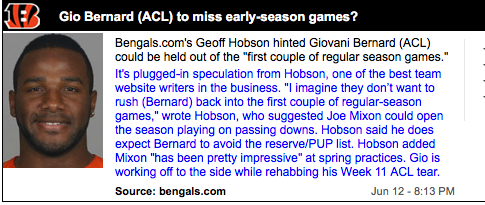 Although Gio Bernard is progressing with his ACL rehab, it looks like the Bengals aren’t rushing back their pass-catching RB by potentially sitting him out a few regular season games. Typically we would take beat writer blabber with a grain of salt at this stage of the season, but Geoff Hobson is a writer who is employed by the Bengals and is not looking for clicks. He has team connections, works in the building and is most likely very informed. Here’s what he had to say: