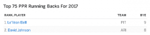 That’s right, Carson Palmer was in the top 10 in passing yards last season. He beat out Derek Carr, Andy Dalton, Russell Wilson, Ben Roethlisberger, and even our Lord and Savior, Tom Brady. Does this sound like the regression that you keep hearing about? The truth is, Palmer’s arm may not be as strong as it used to be, however that does not affect David Johnson. There are not many plays written up where DJ is more than 10 yards up the field as a receiving target, which makes him the perfect candidate for quick dump passes for a quarterback who may catch a case of the noodle arm.