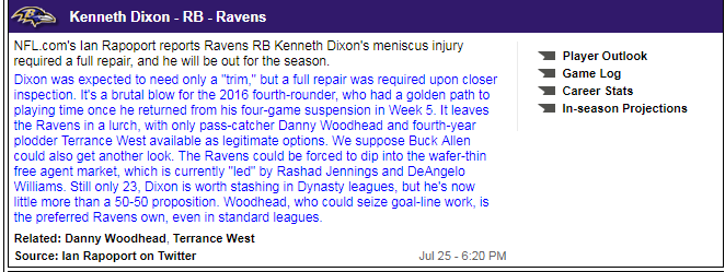 After having his fantasy stock take a hit with a four game suspension, Kenneth Dixon’s stock comes completely off the market with a meniscus injury that will keep him out the entire 2017 season. He can be removed from all draft boards and rankings going forward.