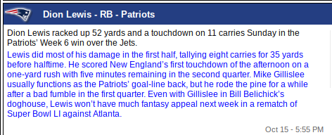 Have Dallas RBs Darren McFadden (51% owned) and Alfred Morris (54%) been scooped up yet? Of course there’s a chance the legal process continues being drawn out, but Ezekiel Elliott is now scheduled to miss six games. My preferred option is McFadden, as I buy into the speculation he’s been a healthy scratch strictly to keep him on ice for this type of scenario, and he’s been the clear featured back in the past here. Still, Morris has been the RB2 of choice in 2017, and could totally be next in line. Both need to be rostered universally while this draws itself out.