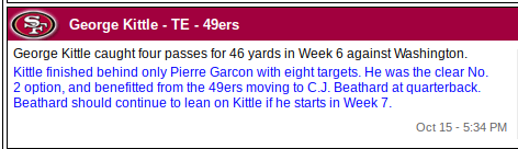 Note: Breida did not post any noteworthy Week 6 stats, and in fact only logged 17 snaps as compared to 56 for Carlos Hyde. Yet, the team could be attempting to “showcase” Hyde for potential trade partners as rumors speculate the incumbent remains on the block. Whether through injury, trade, or gaining the hot hand, Breida feels bound to make starts in the most RB – friendly blocking scheme around, making him a very worthwhile hold in all formats.