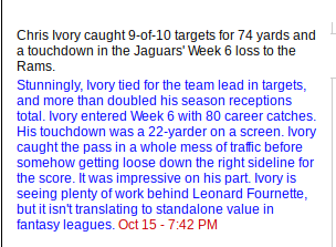 As predicted this summer, Austin Seferian Jenkins (51% owned) is truly an every week TE1. Roll him out with confidence, regardless of matchup, and make sure he’s not lingering on your waiver whether you need a tight end or not.