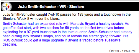 Schuster’s long term ceiling is obviously tied directly to Martavis Bryant‘s status. If he’s traded or remains in the doghouse, Schuster will be banging out awesome TD celebrations more often than ever and be an attractive WR3 moving forward.