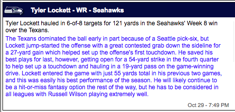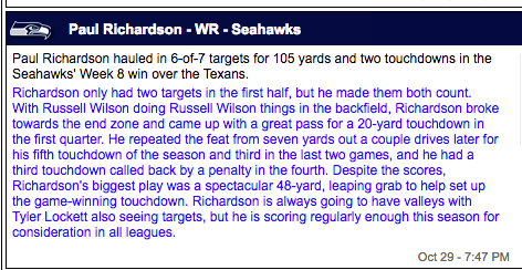 Quick Hit: All prominent Seahawks pass catchers need to be owned with Russell Wilson absolutely dealing right now, although don’t overreact. Since the first two weeks, the Seahawks have abandoned the run while Wilson has hurled at least 295 yards and 3 TDs in 4 of 5 games. He’s as mobile as ever in the pocket, and buying his explosive play makers time to get wide open deep down the field, and Richardson and Lockett have clearly benefited. In particular, Richardson has been finding tremendous space in the red zone and is often where WIlson looks first, resulting in 5 TDs through 7 games so far.