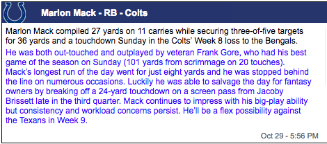 As long as Mack remains owned in less than 50% of leagues, he’ll continue being listed here. Unfortunately, despite Mack seeing his highest volume of the season, Frank Gore took over the snap and touch lead this week and looked like he had plenty of juice in his legs still. Mack showed off explosiveness of his own, ripping off a highly impressive 24 yard touchdown screen where he had to change direction and outrun the defense.