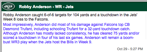 Week 8 was by far his best professional effort, as Anderson won at every level of the field against a tough corner in Desmond Trufant. Anderson brings incredible deep ball speed, and strong body control, to the table, and all have been on display throughout his recent tear. As long as McCown stays upright, this offense and Anderson will continue producing.