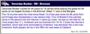 Booker continues gaining snaps and usage by the week, and the pendulum swung more favorably than ever before in Week 11: 47 snaps for Booker, compared to 28 for “starter” CJ Anderson; 19 touches compared to 15; 98 total yard to 56.