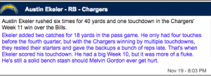 Ekeler notched his second useful game in the same time frame, though this one is a bit more deceptive. He was used sparingly and looking like a major Week 12 bust until the fourth quarter, where he racked up almost all of his touches and production.