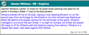 Though the recent output (2 double digit FP outings in his past 3) and schedule (1st easiest) look nice, this committee is impossible to project week-to-week. Williams still played less than Drake (27 to 38 snaps), despite severely outgaining him, while looking like the lesser talent until Week 11. I’d seek alternative, but the schedule is ripe in case one runner can truly separate.