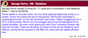 “Clunky” was how NFL Draft Insider Jared Tokarz described Perine to us this summer, and, up until Week 11, this adjective fit like a glove. Yet, against a stiff New Orleans run defense, Perine saw his most work and by far most production while showing more giddy up than he has all season.