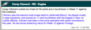 At a certain point, we cannot ignore Clement — yet the industry keeps acting like he hasn’t outsnapped or outscored Jay Ajayi for two straight weeks. Or that he doesn’t have a meaningful role in arguably the league’s most dominant attack as the no-huddle back with a clear nose for the end zone (5 TDs over the past 4 games).