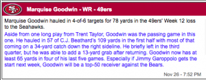 Largely due to Pierre Garcon‘s injury, Goodwin has been on a mini tear over his last 5. He’s topped 65 yards in four of five, and has scored 10, 0 (YUCK), 7.8, 16.6, and 9.8 FPs over that span — all useful outside the obvious egg. This has also been with a creature named CJ Beathard throwing the rock, and a switch to Jimmy Garoppolo would raise Goodwin’s ceiling quite significantly.
