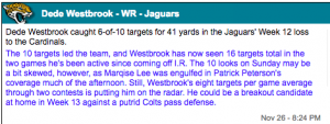 Now, the volume appears en route. It’ll be interesting to see if Dede’s 10 targets were more a result of Marquise Lee getting the Patrick Peterson treatment, or if Westbrook’s truly taking over the top role. Though the former is unfortunately more likely, Westbrook has the talent to ascend atop this totem pole quite rapidly.