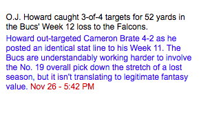 After back-to-back 52 yard weeks, Howard is clearly becoming a larger part of the Bucs offense (certainly greater than that oafish, pathetic white goon named Cameron Brate). Even so, a greater piece of this rotten, stale offensive pie doesn’t mean a whole lot.