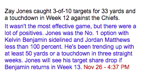 - I doubt he maintains “Alpha X WR” status if/when Kelvin Benjamin returns. Granted, Benjamin is no guarantee to return with a torn meniscus, but Jones’ target share could take a severe dent in the not-so-distant future.