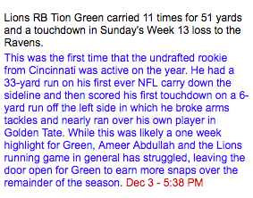 The sample size is minimal with Green, with Sunday marking Green’s first game on an NFL field. Even then, his work was impressive. This offense has been among the more consistent in the league, and Green provided the first spark this run game has seen in weeks. Meanwhile, Ameer Abdullah could remain sidelined, which opens up more opportunity for Green to continue impressing. He’s a long shot, but Green could seize this gig with a second straight quality outing.