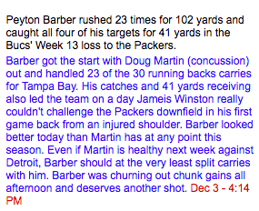 As soon as news broke that Peyton Barber was a starter, we immediately recommended him as a stream during our Week 13 Sit / Start Show (clearly missing out if you haven’t tuned in!) The thinking was fairly easy: he was already the TD guy, and now, as a starter, should be the lead committee, 15ish touch kind of guy.