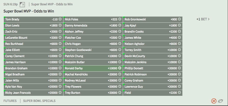 It’s not often you see any minus signs in the odds for a prop like this, but that’s exactly what we’re seeing with Tom Brady coming in at -125. And if we’re being honest, it makes sense — the winning team’s QB has won Super Bowl MVP honors 7 out of the last 10 times, with 2 LBs and a WR rounding out the other 3. And with the Patriots as the betting favorite, it makes sense that Brady is the MVP favorite. He’s the safe pick, sure, but where else can we look? Well, obviously Foles is a safe bet if the Eagles win, but I’m gonna throw out some non-QB picks here, just for the hell of it. For an Eagles win? I like Zach Ertz at +2000. Along with coming off a career year, Ertz has quickly become Foles’ go-to guy in the passing game. Most recently he hauled in all 8 of his targets for 93 yards against Minnesota, and he possesses a rare combination of size, quickness, and hands that could make life hell for the Patriots D in this one. He’s my money pick if Philly wins. And for the Patriots? Look no further than Danny “Playoff” Amendola at +1800. The man just makes plays when it matters — whether it’s last year’s Super Bowl (8 for 78 and a TD + a 2-point conversion) or the AFC Championship against Jacksonville (7 for 84 and 2 TDs, including the game-winner), he’s got ice in his veins and — perhaps more importantly — Tom Brady’s trust. With dynamic guys like Rob Gronkowski and Brandin Cooks to worry about, Philly probably won’t be able to give Amendola as much attention as they should, and he could have a huge game in this one. Officially my pick is Brady because I want to be right, but if you want a low-risk, high-reward play for this one, Ertz and DA are my guys.