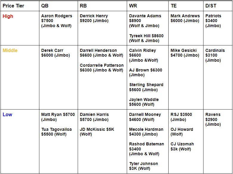 Jimbo: Mecole Hardman/Rashod Bateman: If I pivot off of Tyreek to go for Derrick Henry so to say, then I’ll go with Hardman as my cheap guy. Otherwise, I’ll be rolling with Bateman who started slow last week despite a respectable six targets in the offense. The Ravens clearly need more from their receivers, and the rookie first-rounder has serious talent and upside if he can get the ball.