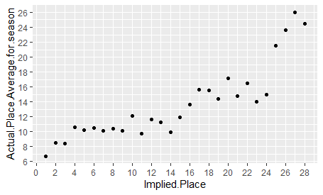Ninth, 15th, and 20th places have a particularly higher average actual place than the places around them. Will the law of averages win out rest-of-season, meaning that teams with those particular implied places will underproduce?
