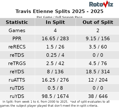 Etienne’s workload has equaled out to around 12.7 xFP/g (RB23). Before the two quieter games he was averaging nearly 17 fantasy points and 100 YFS/g.