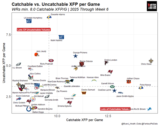 Stafford and Adams have been fruitful, but not in lockstep with each other. Only around 50% of his xFP have been deemed catchable according to Fantasy Points data.