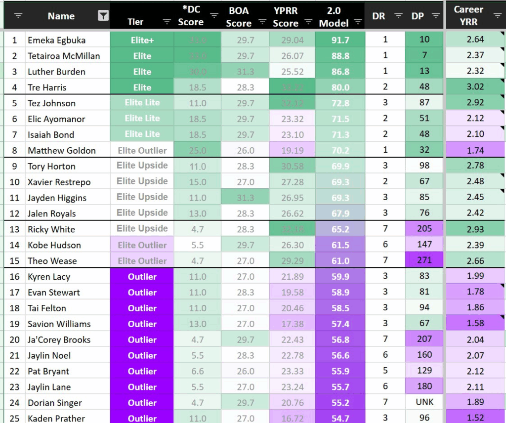 “Extremely quick and explosive. Creates consistent separation and is a shifty runner with the ball in his hands + a threat for a chunk play every time he touches the ball. Has good hands and can make contested catches in traffic.”
