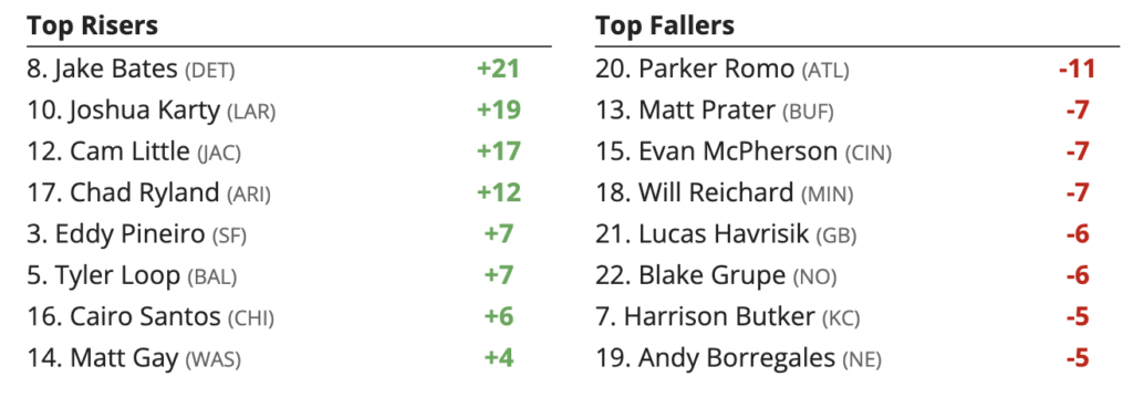 Week 9 Kickers (K) Rankings Higher and Lower