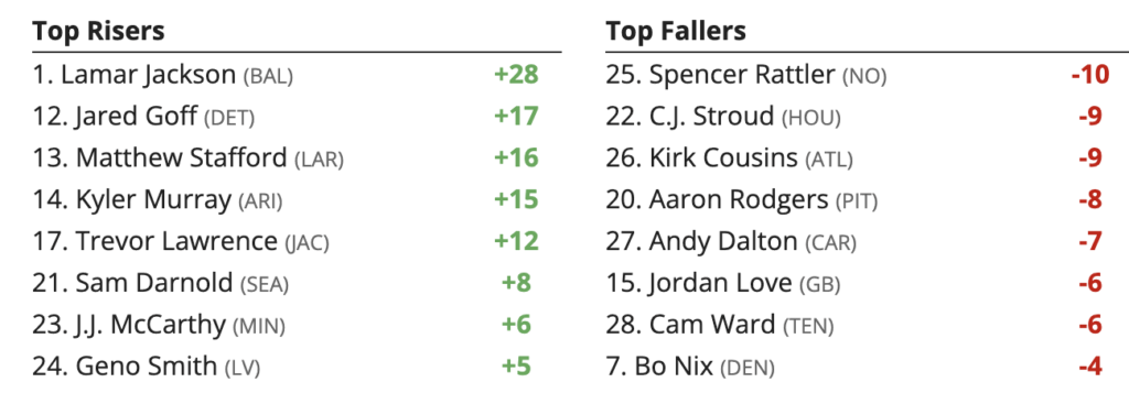 Week 9 Quarterback (QB) Rankings Higher and Lower