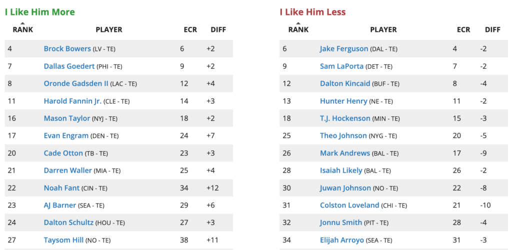 2025 Rest of Season TE Rankings Higher & Lower (Week 9 Update)