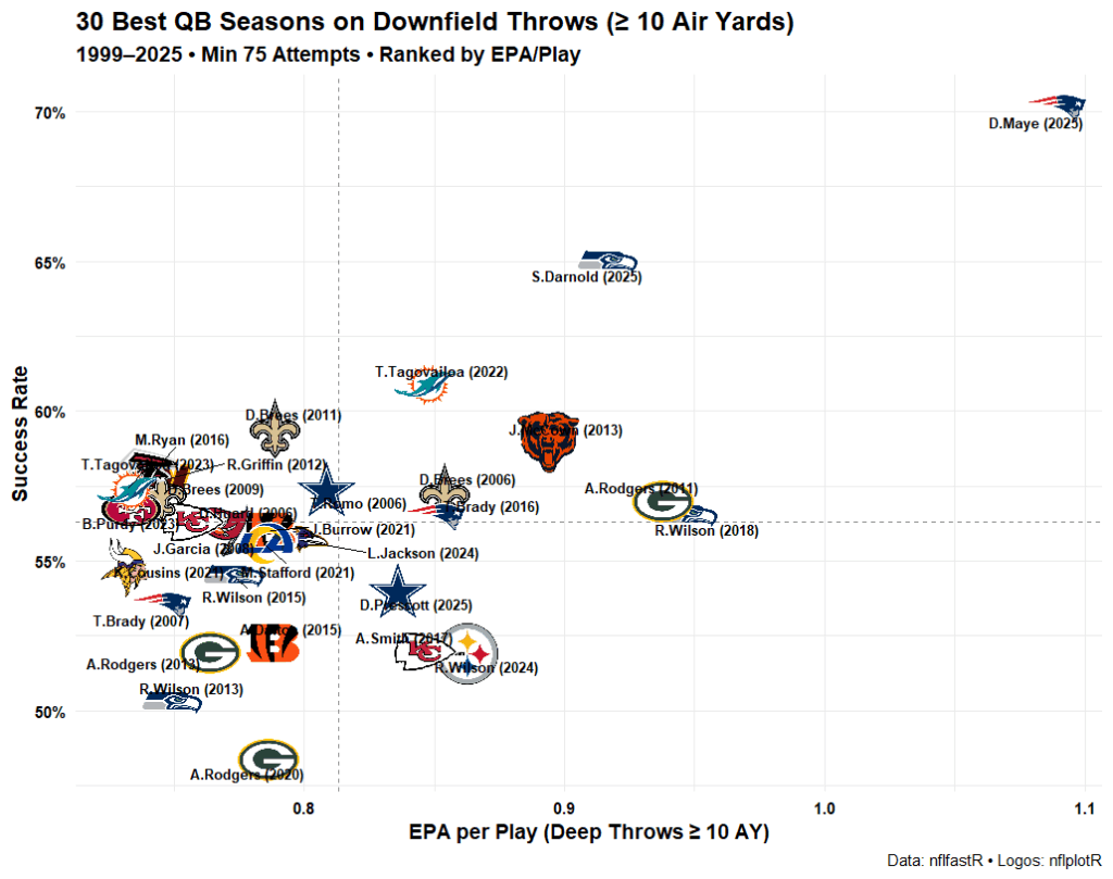 Drake Maye is the best deep passer in football right now and is in the middle of arguably the best deep passing season ever.