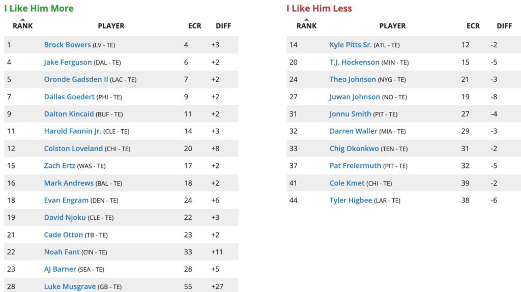 2025 Rest of Season TE Rankings Higher & Lower (Week 9 Update)