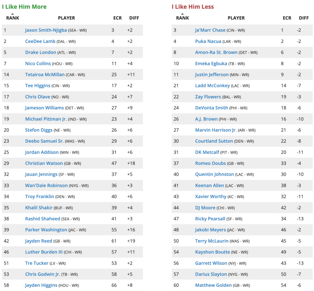 2025 Rest of Season Rankings Fantasy Football – WR Higher and Lower (Week 12 Update)