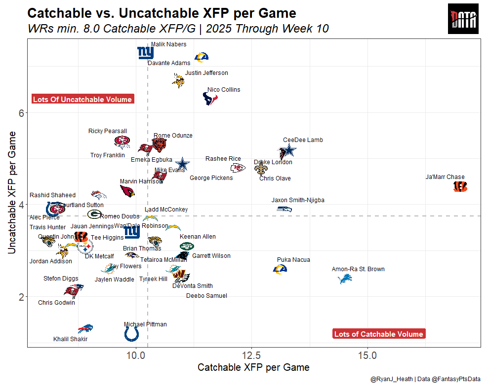 Still, despite averaging 10.8 targets per game, FantasyPoints data shows that his catch rate has bottomed out at 43% (78th among 82 qualified WRs).