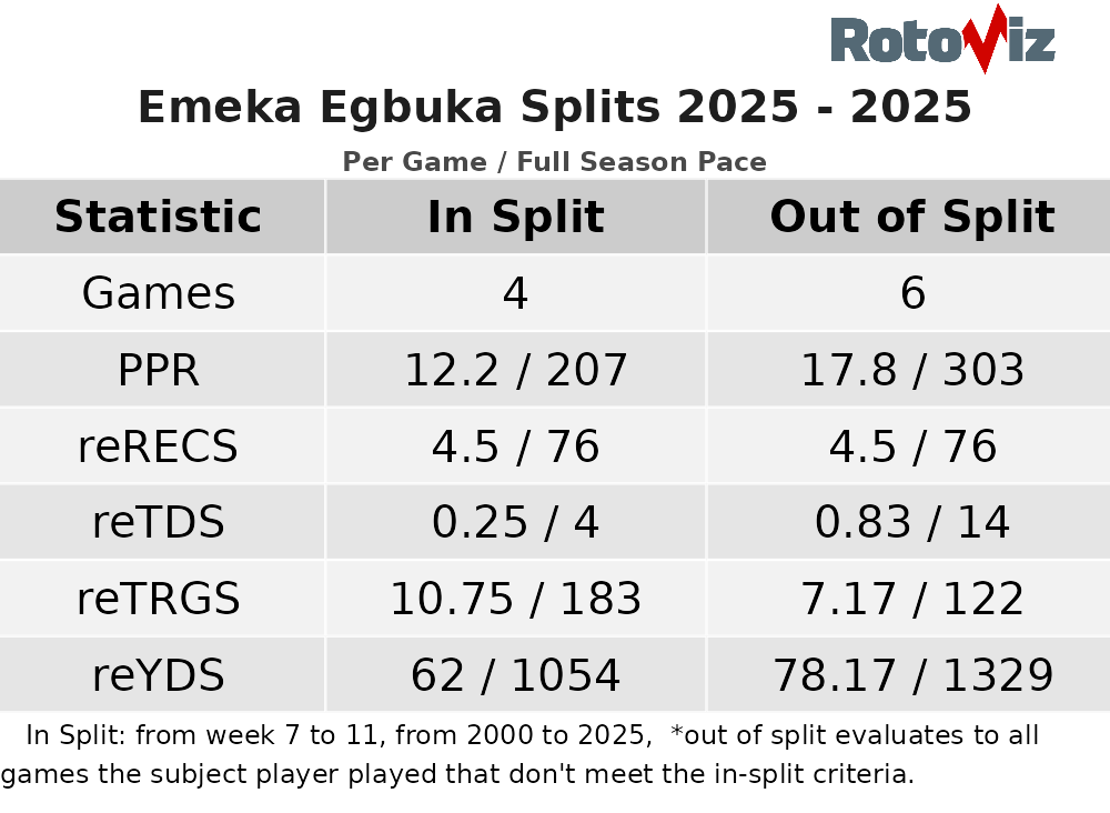 During that same stretch, Baker Mayfield has a 52% catchable pass rate when targeting Egbuka. That ranks dead last.