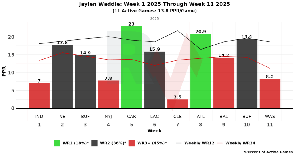 Waddle has scored at least 14 fantasy points in 7 of 11 games and has consistently been a WR2 or better (54% of games).