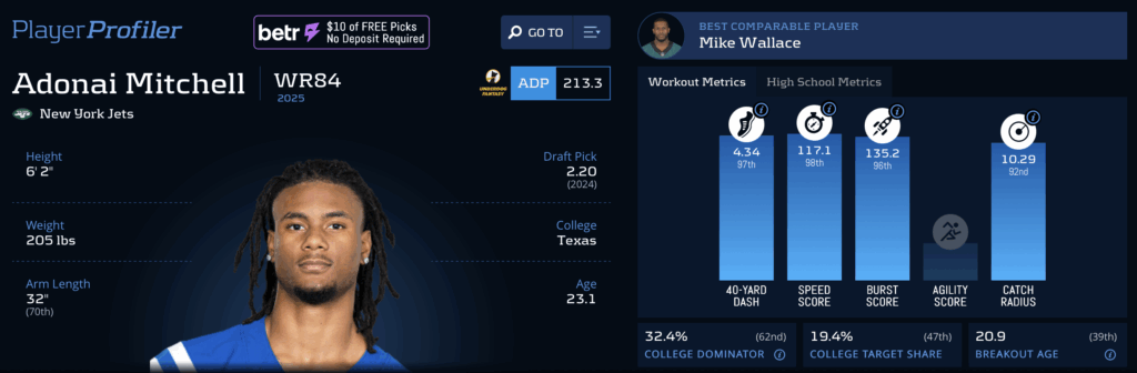 Mitchell is one of those receivers who was custom-built in a football lab. He’s tall, explosive, smooth, and can stack a defensive back in a hurry. In 2023, he handled 86 targets at Texas and dropped only one, which was a testament to his hands, even if the early part of his NFL career hasn’t always shown it. His 16.0 aDOT highlights exactly what makes him such an enticing downfield weapon: he wins at the line, accelerates into space, and can roast single coverage.