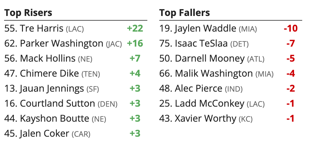 – Rashee Rice is in concussion protocol and did not practice on Thursday. He seems to be on the wrong side of questionable at this rate. He has been steeply downgraded, while Travis Kelce gets a slight volume bump. Xavier Worthy was better (not good though) without Rice, and is more usable now for the desperate. If Rice sits, this is murky situation to mostly avoid without Patrick Mahomes anyways.