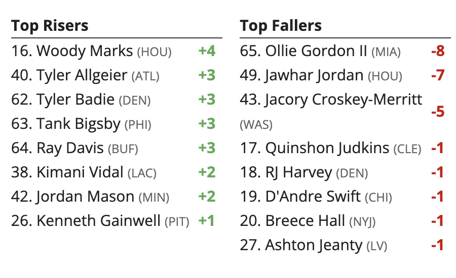 –Jawhar Jordan has been elevated back to the Texans main roster, signaling they value him and did not want to risk another team swooping in. If one of Woody Marks or Nick Chubb miss this game, Jordan has true appeal for those desperate enough for his services (like myself). The Texans are 14.5 home favorites over the Raiders, and Jordan or whoever the RB2 is should have plenty of mop-up time. He rises up the Week 16 Fantasy Football rankings, but will quickly fall if both Marks and Chubb seem likely to play.