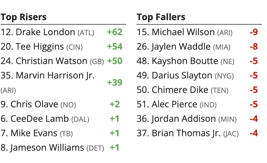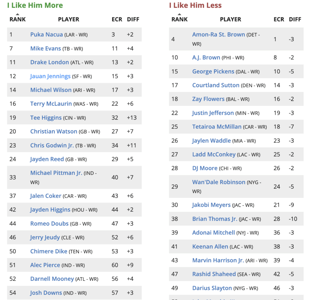 – Marvin Harrison Jr. is trending towards playing. He said his heel is “good enough to go.” Last time he was in, MHJ led the team in targets while Michael Wilson took a back seat, despite Wilson being insanely more productive. I think the gap has narrowed in MHJ’s latest absence, but Wilson can no longer be ranked in my Top-6 WRs. He takes a hit on the Week 16 Fantasy Football Rankings.