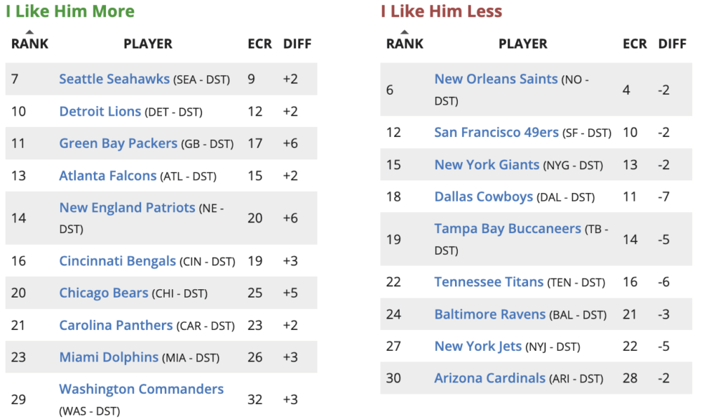 Updated Week 16 Defense / Special Teams (DST) Rankings Higher and Lower