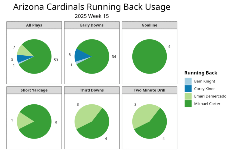 We’ve only seen one other game with Carter seeing above 65% of the rushes. This happened in Week 5, following Trey Benson‘s injury. During this game, Carter posted 23 touches (5 receptions), 73 YFS, and 1 TD — good for 18.3 PPR FPs and an RB9 finish.