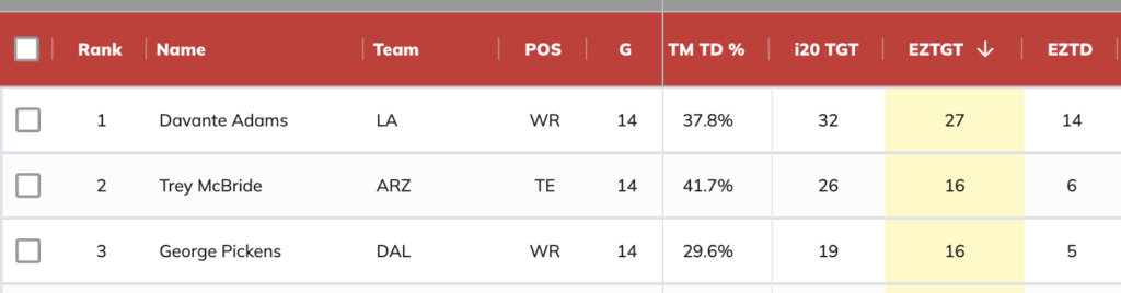 Adams has become a pseudo goalline back for the Rams this year. Per Fantasy Points’ Data, Adams has a whopping 27 End Zone targets and 14 End Zone TDs this season. Trey McBride is the next closest with 16 end zone targets (-11) and 6 TDs (-8). That is a CRAZY discrepancy.