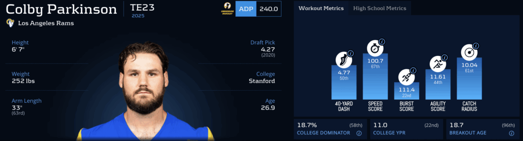 Parkinson’s historic lack of TDs is a bit odd, given his mammoth size. At 6’7″, Parkinson is in the 98th percentile among NFL TEs for height. The rest of his profile is middling-to-underwhelming, with slightly above-average weight-adjusted speed scores and catch radius, but otherwise subpar burst and agility via PlayerProfiler: